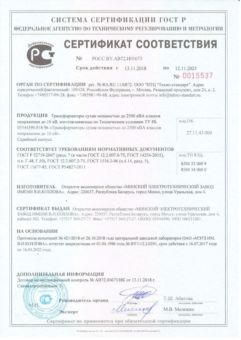 Сертификат на трансформаторные подстанции 6-10 КВт на 2017-2020г.
